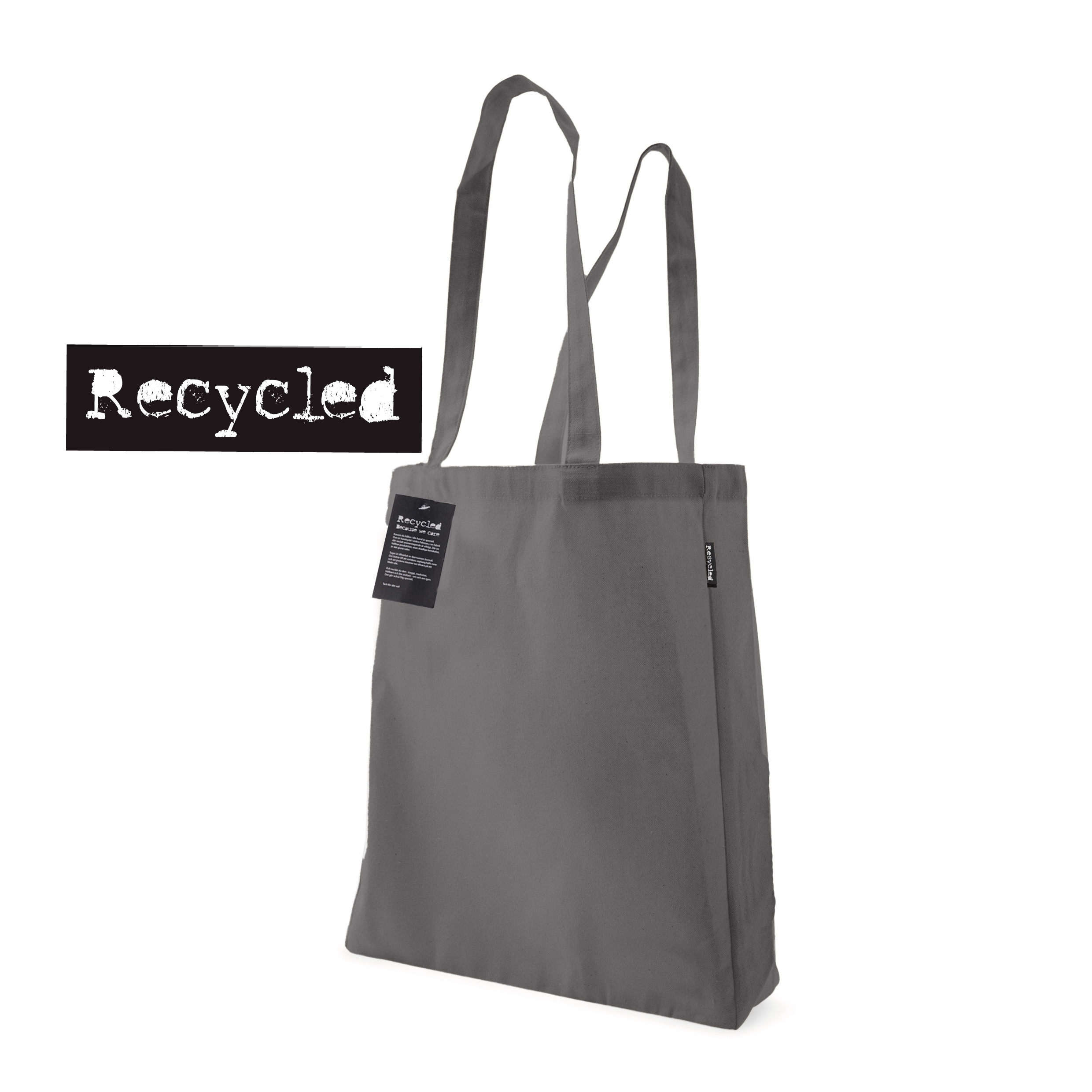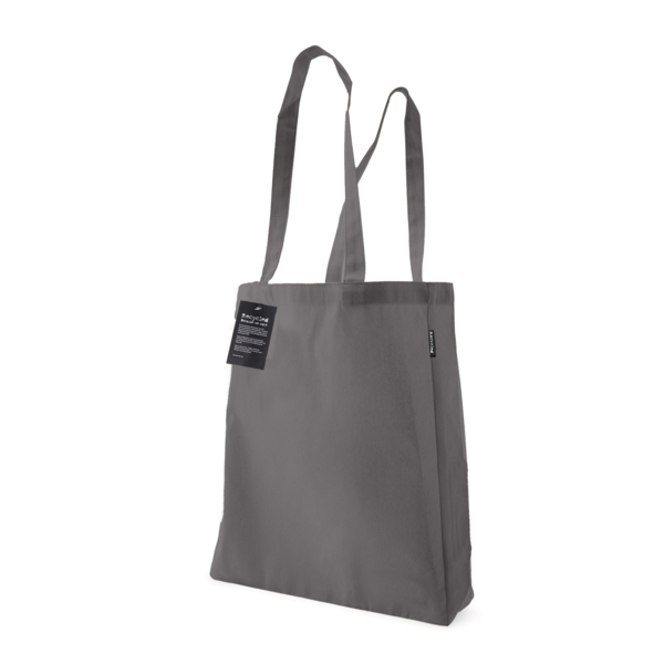 Article No. 40104501This cotton bag is made of 250 gram recycled cotton. The bag features a sewn-on "Recycle" label on one side. A hanging tag, which is fastened with hemp string, tells about the background of the bag and informs what our CSR work stands for.