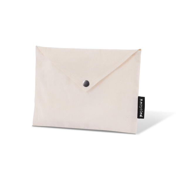 Article No. 40224800"This fabric pouch made from recycled cotton, in the shape of an envelope with a snap button, is perfect for gift cards, travel essentials (such as tickets, earplugs, headache tablets, etc.), or for organizing your small items. The pouch acts as a mini bag inside your bag, helping you keep small items organized, or provides a lasting holder for gift cards that can be reused over and over again. Customize it with a message or company logo. Unlike single-use materials, it can be used repeatedly! The envelope is labeled with a Recycle tag on the side seam to highlight the sustainable choice.