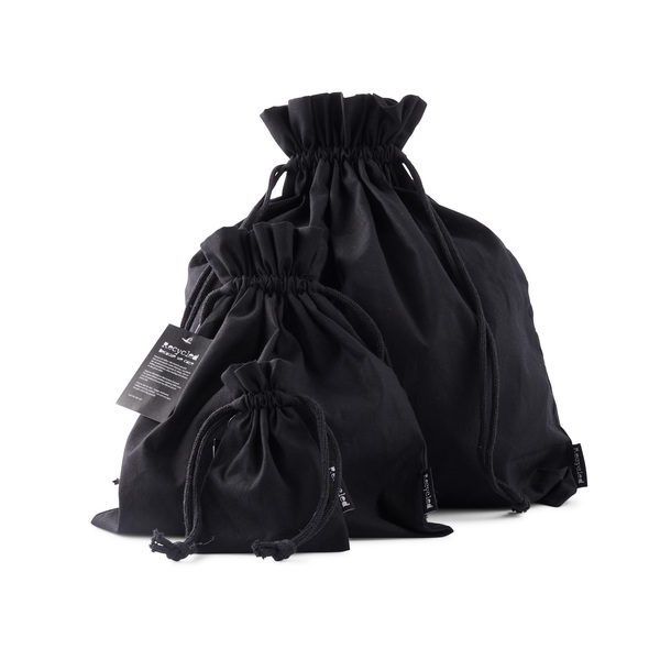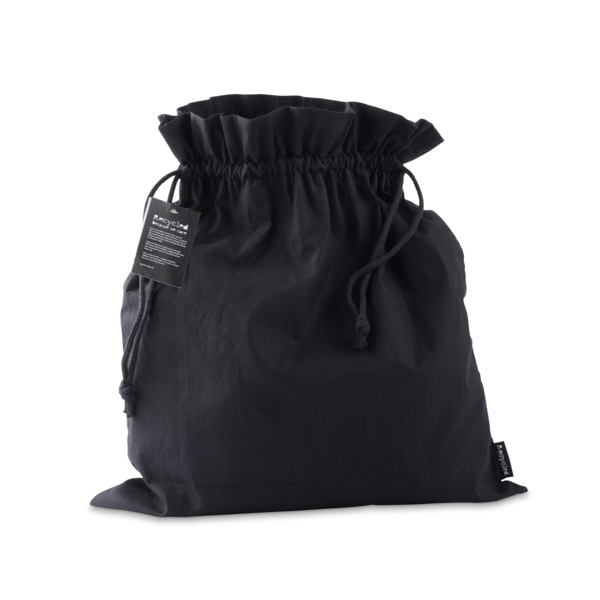 Article No. 40234602A storage bag made from recycled cotton, closed with drawstring cords. Size L is the largest in a series of three sizes, measuring 45 x 50 cm. This gift bag is ideal for packaging or storing many products. Unlike single-use materials, it can be used again and again! The bag is made from recycled cotton and features a Recycle label on the side seam to highlight the sustainable choice.