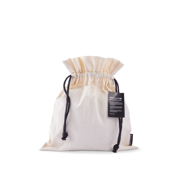 Article No. 40234801NEWS! A storage bag made from recycled cotton, fastened with drawstring cords. Size M is the medium size in the series of three sizes, measuring 30 x 35 cm. This gift bag is perfect for packaging and storing a wide range of products. Unlike single-use materials, it can be used again and again! The bag is made from recycled cotton, also known as post-consumer recycled cotton. This means it is crafted from leftover fabrics, scraps, and similar materials that have been repurposed and woven into new bags instead of being discarded. The recycled cotton helps reduce global waste and ensures that the Earth's resources are handled wisely. A hangtag provides information about the fabric and notes that the bag is produced in a socially responsible factory without harmful chemicals. The gift bag is marked with a Recycle label on the side seam to highlight the positive choice.