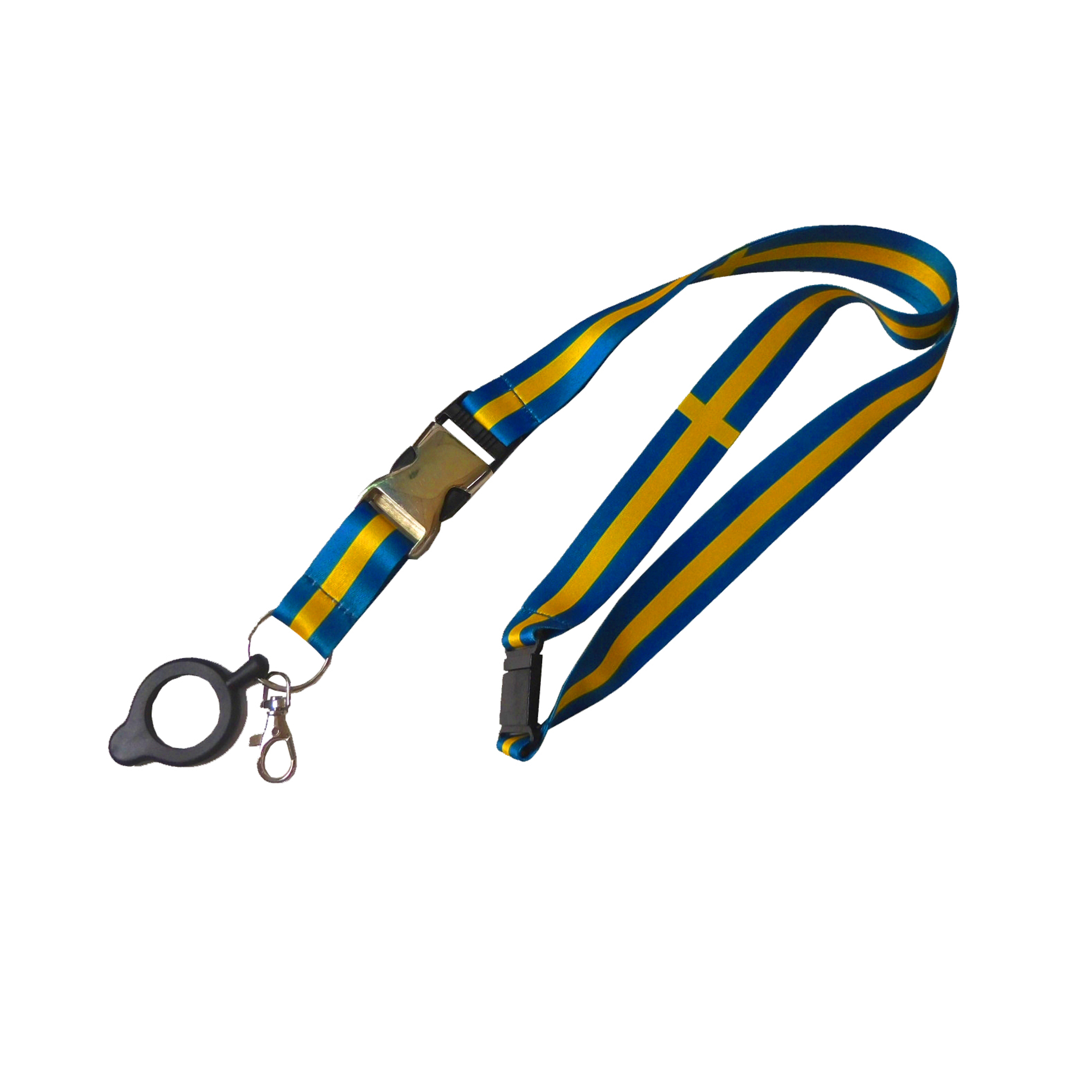 Article No. 85014153Swedish flag lanyard with removable quick release. Features a drink holder and snap hook on the key ring. The strap is extra soft, sublimation printed, and has a safety buckle in the neck. Immediate delivery from stock. With custom print from factory - Estimated 3-4 weeks. (Prices quoted apply to stock order as shown, without own print)