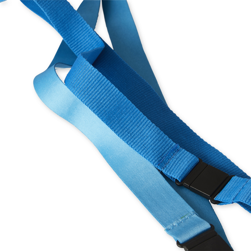 Choose to make your lanyard in extra soft satin ribbon design instead of traditional ribbed woven material. With extra soft, the finish becomes shiny and soft with a satin feel. Compare the difference in the picture where the darker blue lanyard is standard and the lighter with the option extra soft.
