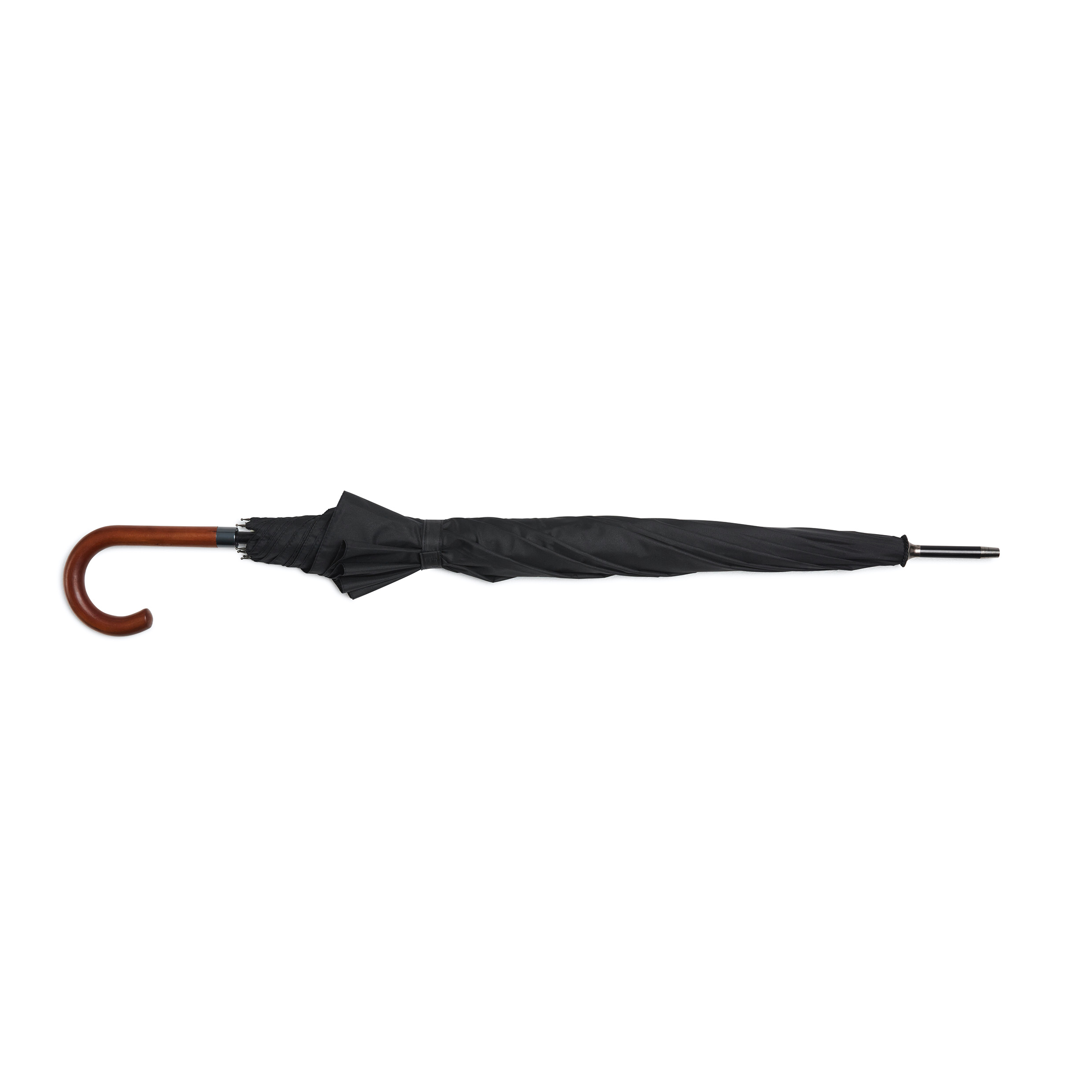 Article No. 20434600A stylish umbrella with graphite ribs, making it sturdy and resistant to wind. Classic J shaped handle in wood. With its 120 cm in diameter, it is a hybrid between a golf and standard size umbrella. Automatic opening. Eight panels. Shaft, tips and top in black varnished metal.