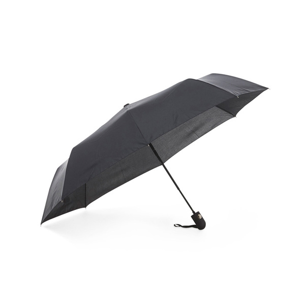 Article No. 20334601Our Key umbrella in an environmentally smart alternative where the panels are made of recycled PET (R-PET). A sturdy compact umbrella with graphite rod and automatic folding, it also has a rubberized handle with wrist strap and 8 panels. The R-PET option is marked with a hang tag and a discreet tone-on-tone print on the strap. The material description is on the inside of the panels. Key R-PET is available in black.